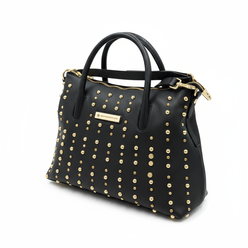 Il nero martellato conferisce a Domy un carattere elegante e versatile. La texture martellata esalta la profondità del nero, mentre le borchie aggiungono quel tocco rock che la rende unica. Il nero si abbina perfettamente a qualsiasi outfit, dal casual all'elegante, rendendola la borsa ideale per ogni occasione.
