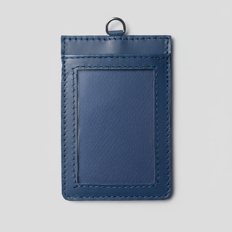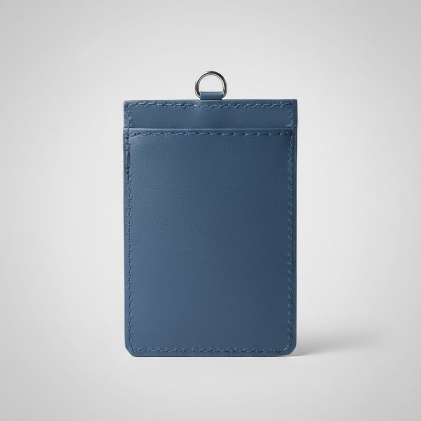 Elegante porta badge realizzato interamente a mano con pelle italiana di alta qualità, nella raffinata tonalità blu. Un accessorio professionale che unisce funzionalità e stile artigianale.